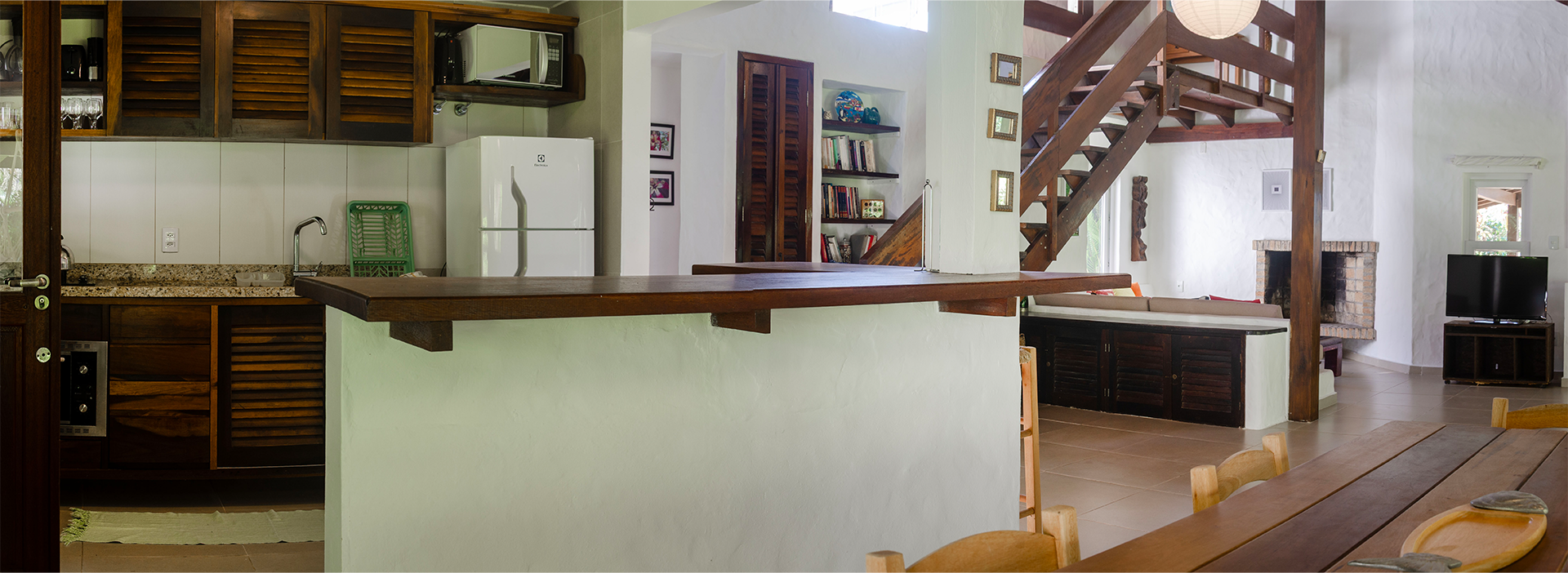 para longos almoços e jantares de confraternização. A grande mesa de madeira maciça