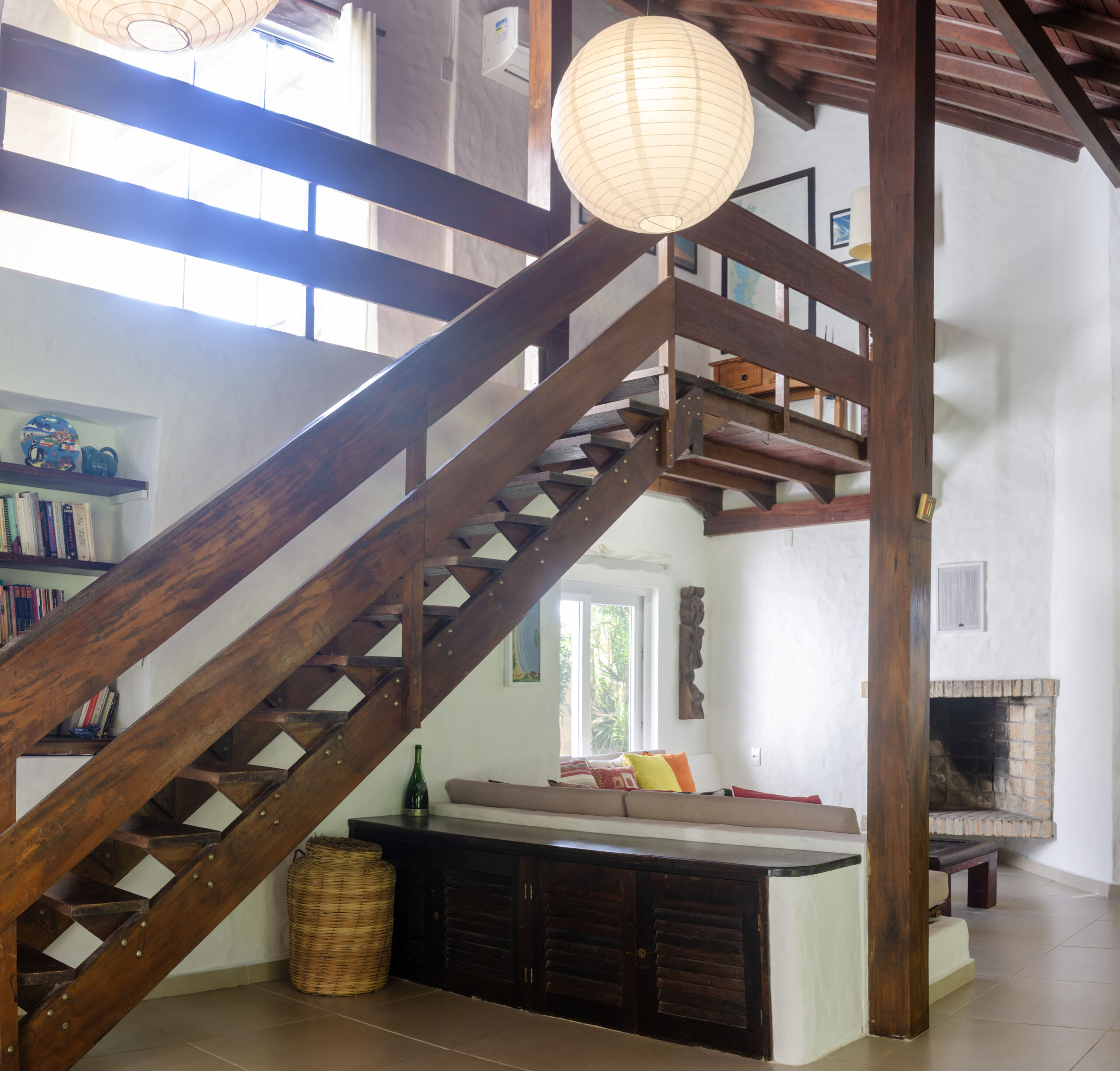 o lindo teto de madeira aparente e as vigas estruturais que adicionam um caloroso toque