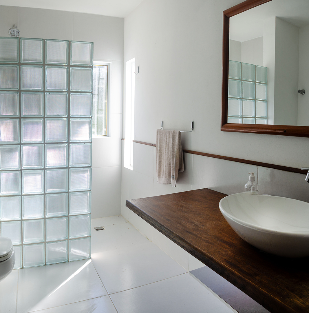 Os interiores são um convite ao bem-estar. A sala de estar se destaca com seu pé-direito alto,